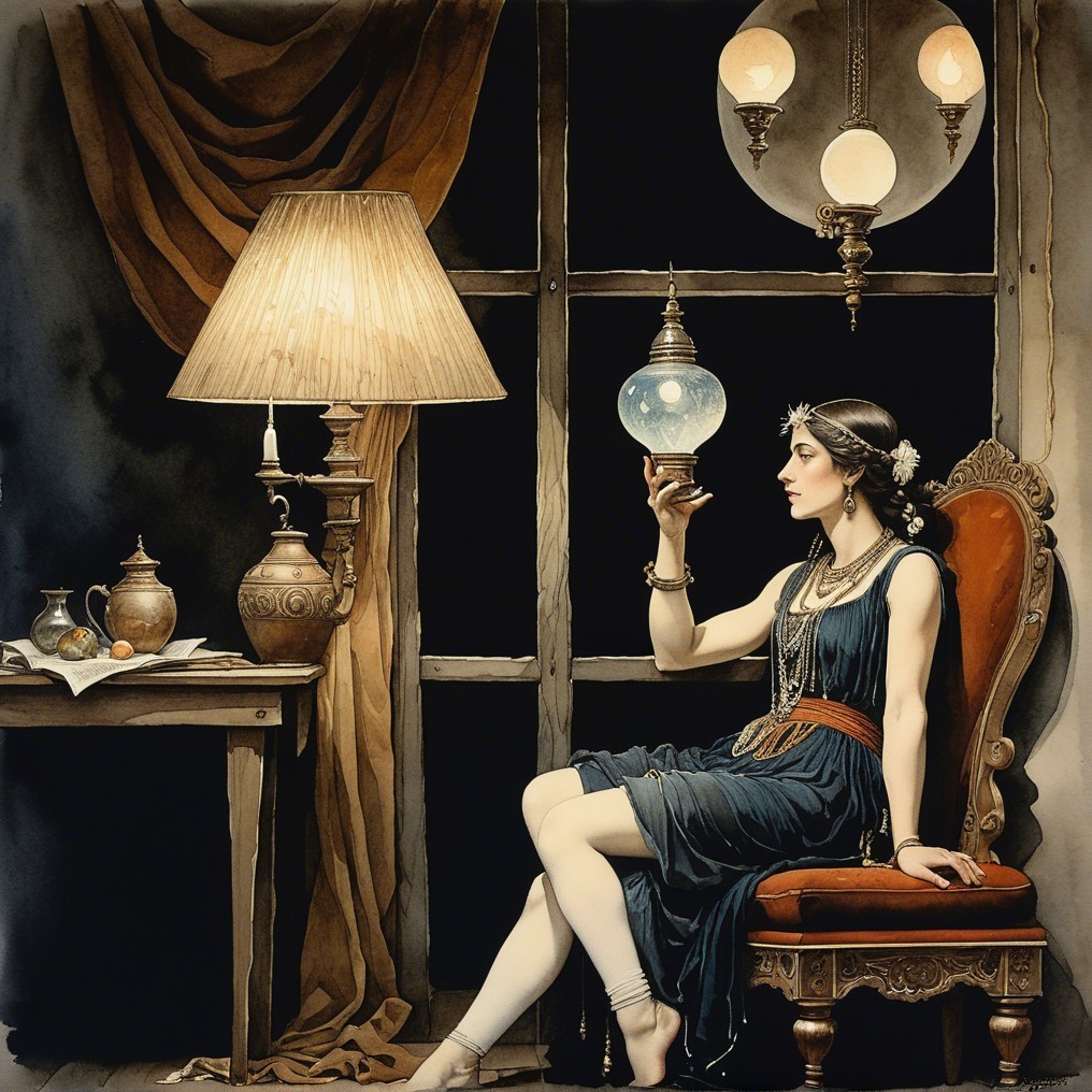 Gypsy shaman. , colored ink drawing, watercolor artwork on old withered paper, vintage, by Caravaggio, Fragonard, Anton Pieck, pale colors, high detail, intricately detailed, hyperdetailed volumetric lighting, magical realism., whimsical, beautiful, poignant, touching. colors sepia tones. soft watercolor extra water in magical realism by Annigoni, Egon Schiele, Milo Manara, Botticelli, Catrin Welz-Stein, Jean Metzinger, Klimt, highly detailed, sepia colors, hyper detailed. Watercolor and ink splatter, dynamic pose, dark blue background, unreal engine, alphonse mucha, global illumination, detailed and intricate environment Beautiful woman in the style of Pino Daeni, Dorota Piotrowiak Edward Gorey, junji ito, klimnt , gold leaf color, silver leaf color beautiful dynamic lighting high definition hdr * Random prompt award winning Max Ernst ultra detailed 4K 3D Texture