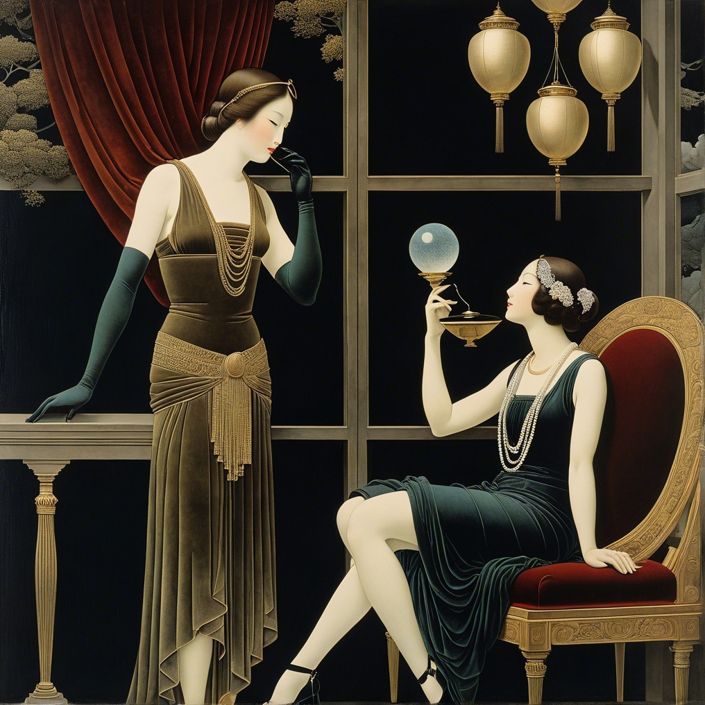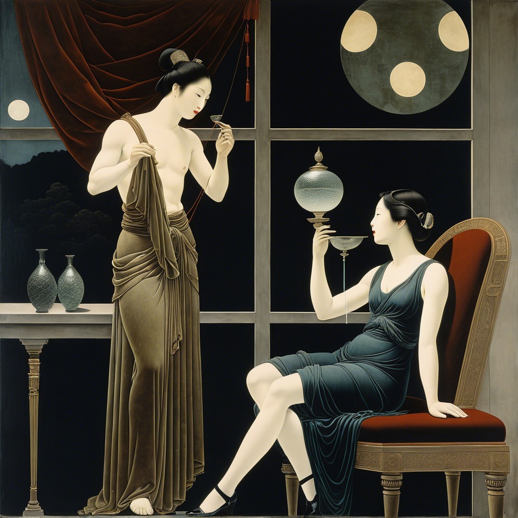Surreal dream of ancient cities in the style of Watanabe Shōtei, nostalgia, glory, Mercury Glass patina, light and gossamer haze, topographic lines, Art Brut, moody, somber, desaturated colors. In the style of John Rogers cox . This artwork amalgamates the artistic styles of Michael Parkes,