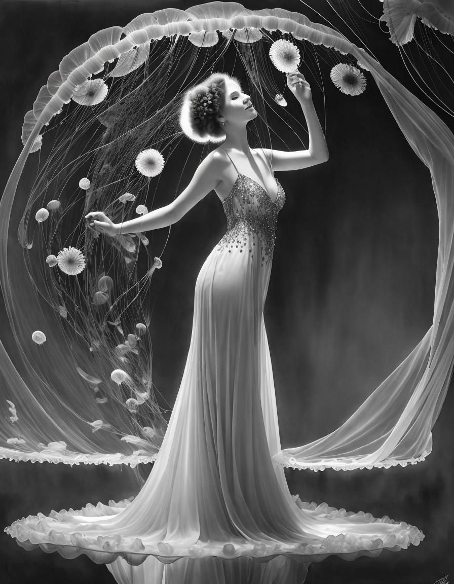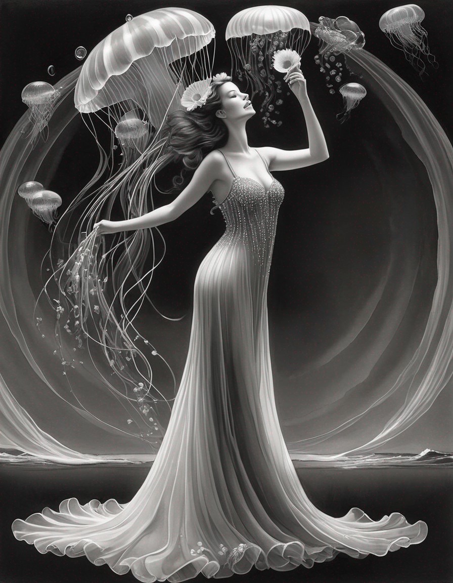 A woman in an elegant dress stands among floating jellyfish, exuding a mystical and serene ambiance.