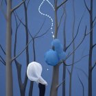 A dancer leaps gracefully against a backdrop of tall, bare trees, with a large, luminous moon illuminating the scene. The color palette features cool blues, conveying a serene, dreamlike atmosphere.