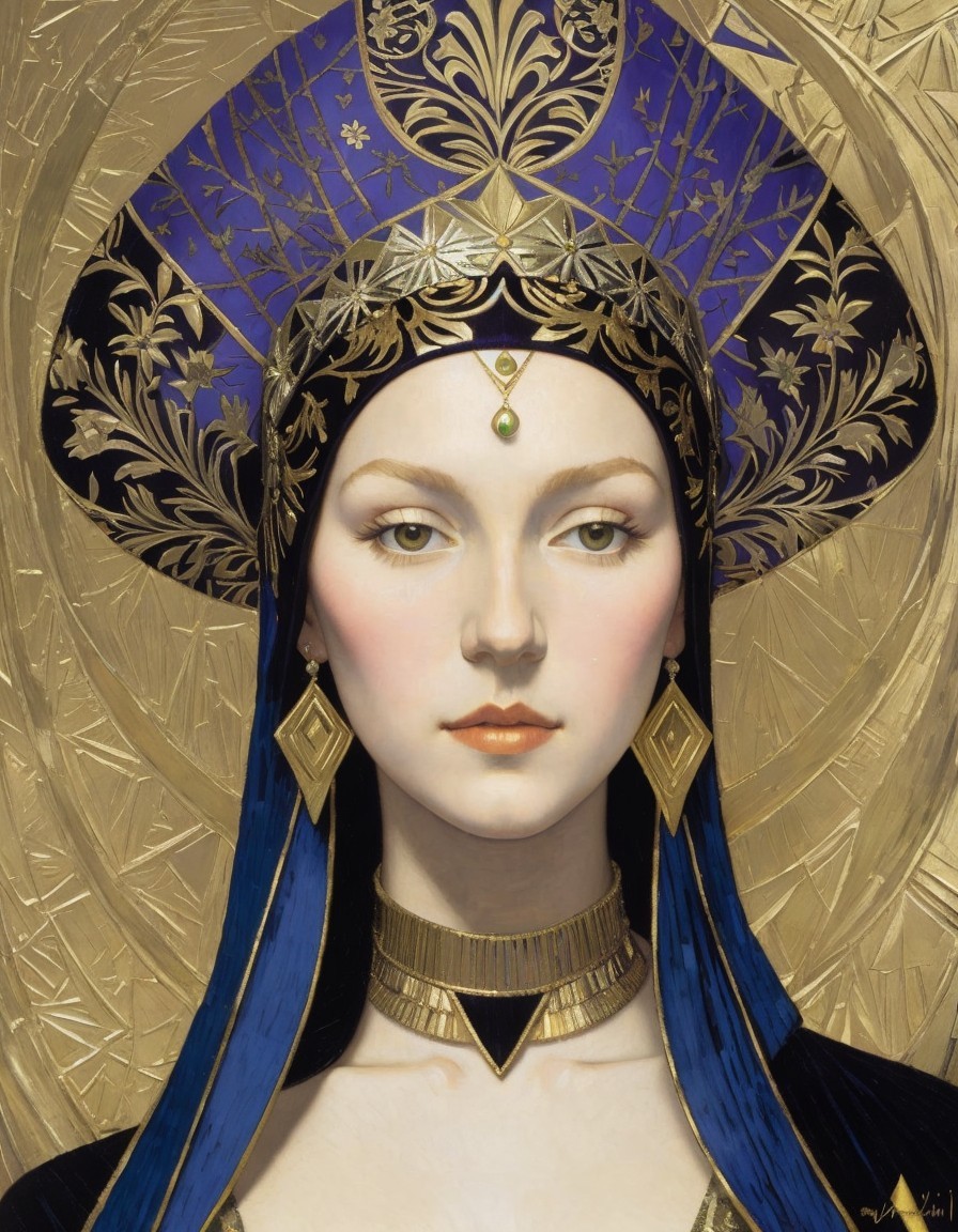 A stylized portrait of a woman with a golden headdress, blue veil, and starry background, reminiscent of Art Nouveau influences.