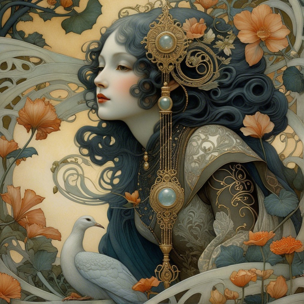 The image features a serene woman with flowing blue hair, adorned in intricate golden jewelry. She is accompanied by a graceful white bird, surrounded by elaborate floral patterns.
