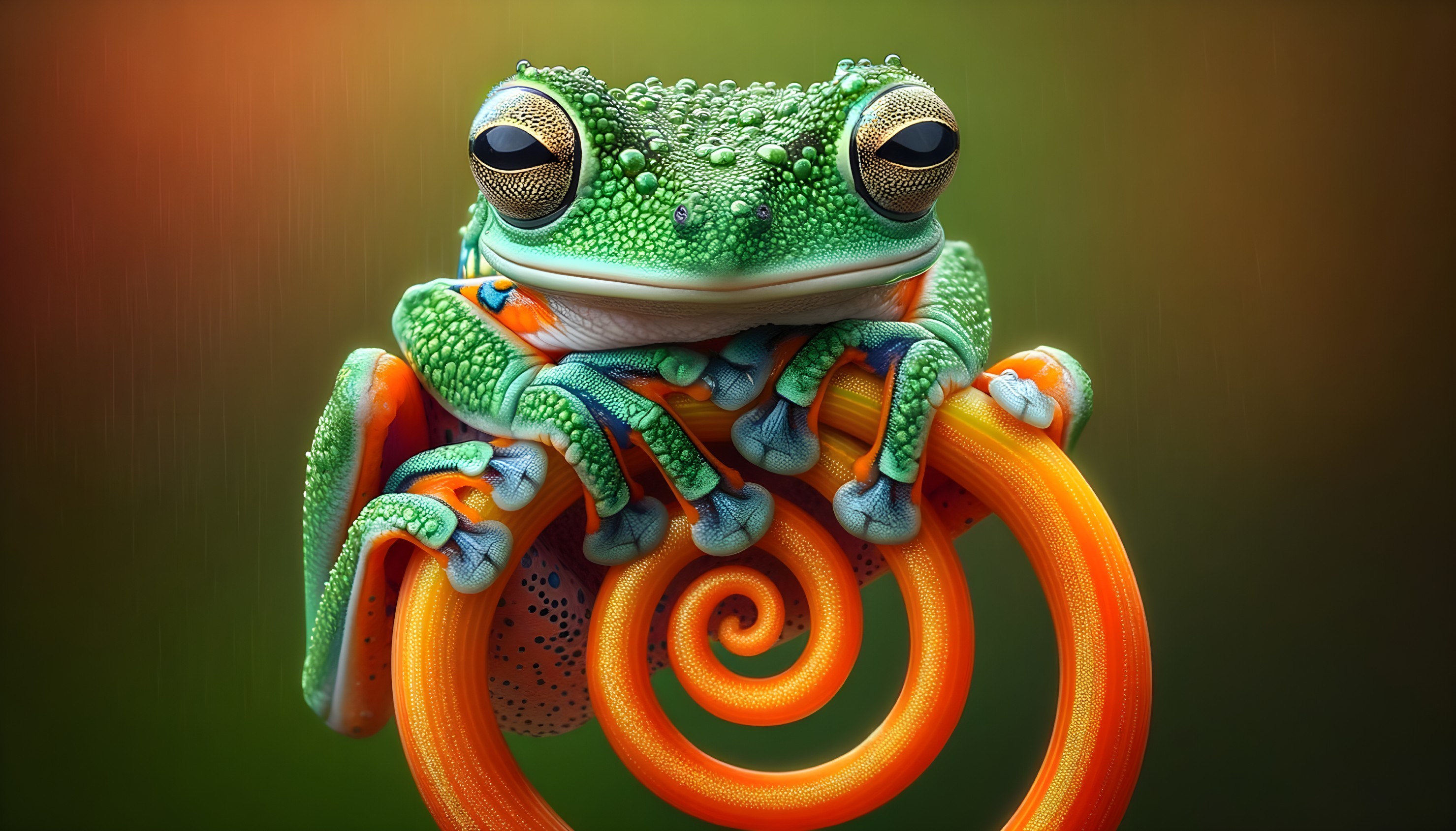 A vivid image of a small green tree frog with granular skin, adorned with tiny dark green and blue spots. Its golden eyes exude curiosity as it elegantly perches on an orange spiral plant stem, delicately gripping with its fingers and toes. The soft, defocused background enhances the sharpness and color contrast of the frog and its surroundings