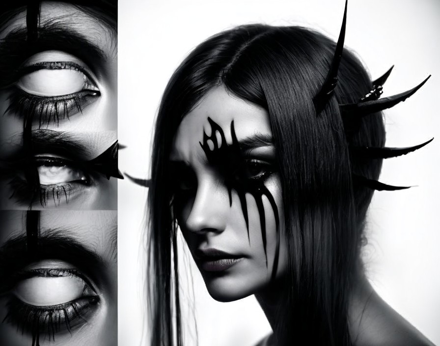 Monochrome image: Person with dramatic black makeup, dripping effects, spiked embellishments, dark gothic