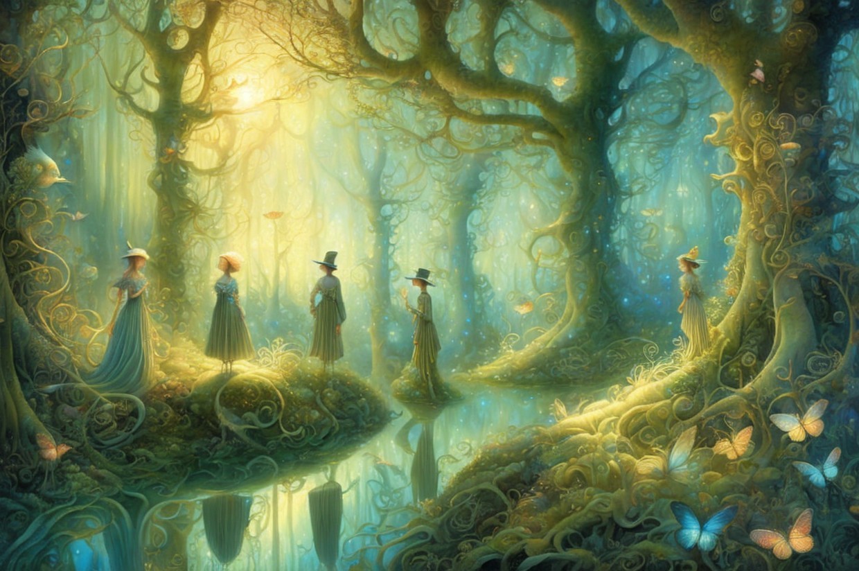 An enchanting forest scene with ethereal light, elegant figures in vintage attire, and vivid butterflies amidst ancient, twisting trees.