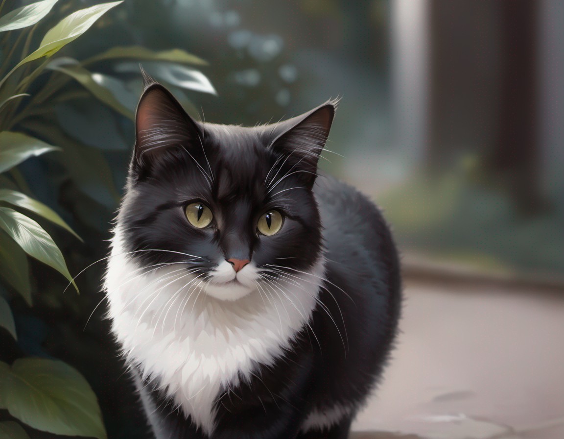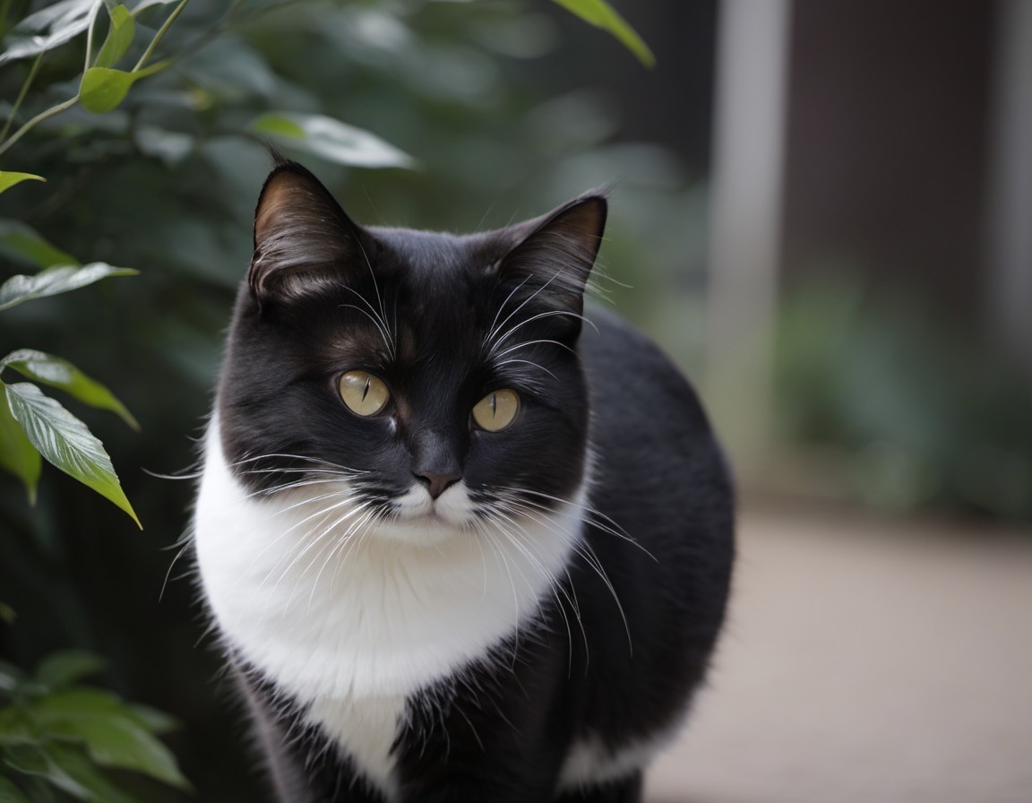 A black and white cat with a fluffy fur coat and piercing green eyes sits in front of a leafy backdrop.