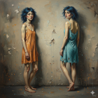 Image of two voluptuous, sexy women. Oil on canvas, ink and pen, surreal brushstrokes, minimalism, oil painting. The textured background depicts a dark gray or light brown wall with visible chippings and cracks. Soft, diffused, and scattered light contrasts with the dark background. Two beautiful, voluptuous women, barefoot, wear short, strappy, and threadbare dresses. Their red hair is disheveled, with the imaginary wind gradually transforming into a chaotic image. Mystical and poetic light and radiance, minimal elements, maximum use of the play of light, tonal transitions, and painterly effects. The style is Claude Monet and Jan Vermeer. Magical, dreamlike, and bold brushstrokes, oil on textured canvas, dynamic splashes, the essence of Van Gogh in the center of the faded, forgotten wall, and nothing more. Full format, no cropped edges, no frames, no text, no copyright.
