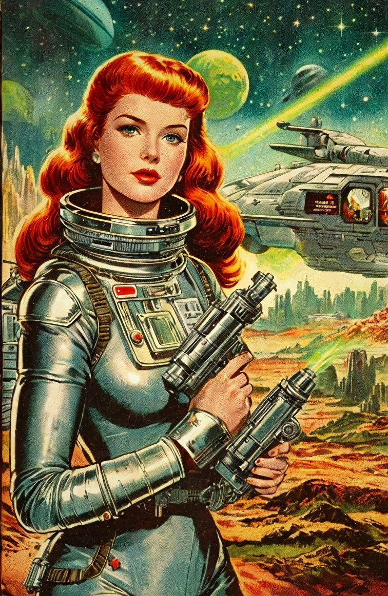 A retro-futuristic illustration of a red-haired woman in a spacesuit, holding a blaster, with spaceships and alien landscape in the background.