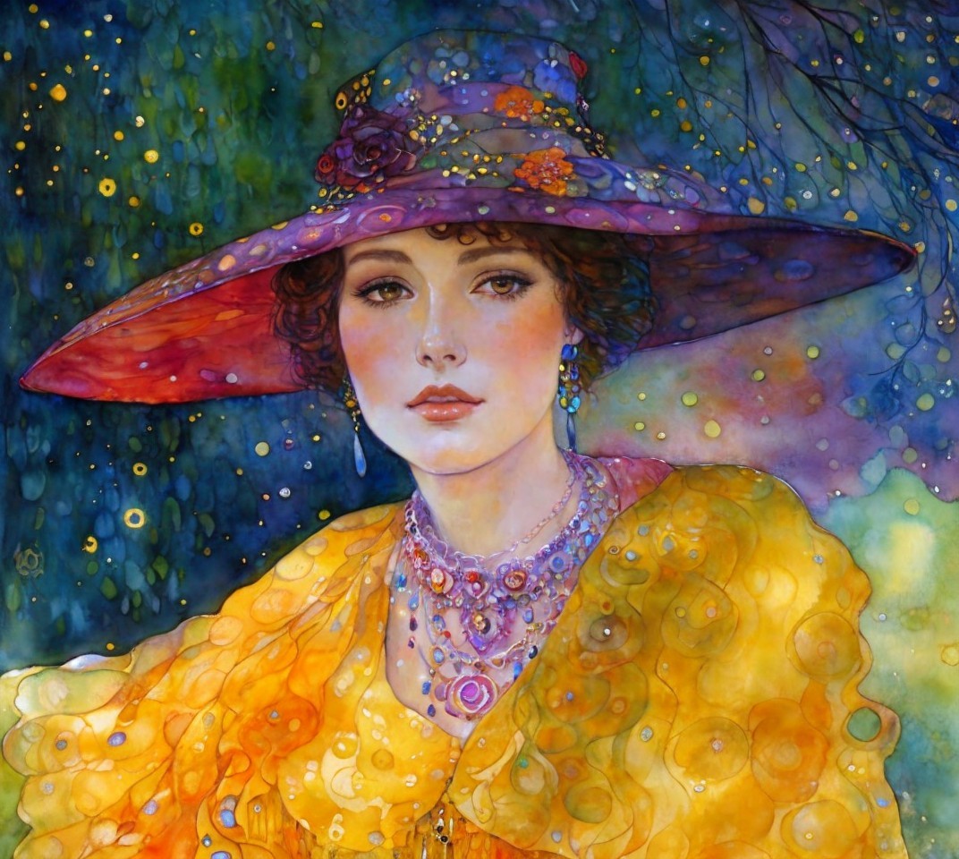 A painting of a woman with a stylish hat and yellow shawl, featuring vibrant colors and a mosaic-like background.