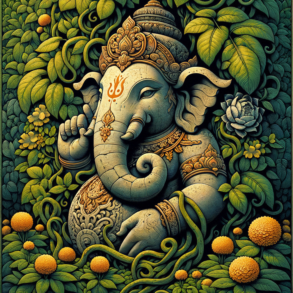An ornate, artistic depiction of the Hindu deity Ganesha with intricate designs and lush greenery surrounding the figure.