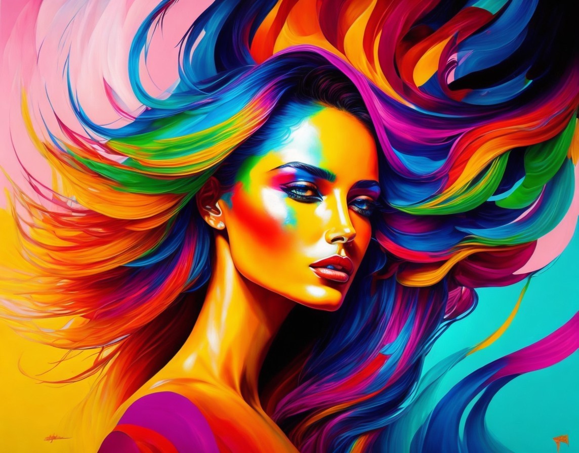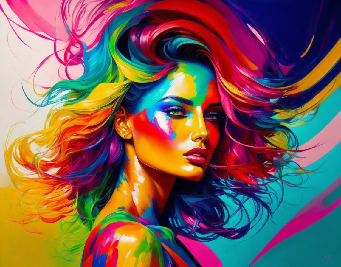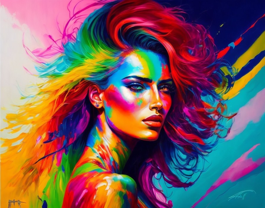 A portrait of a woman with vibrant, multicolored hair and bold, colorful makeup against a gradient background.