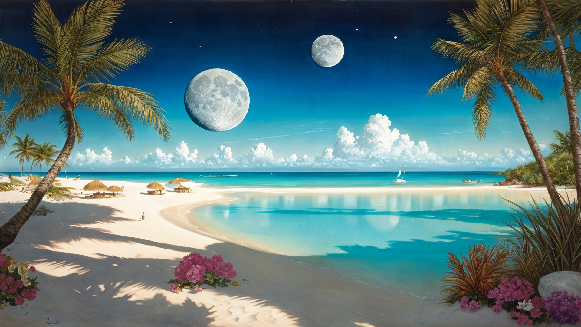 A serene landscape features a tranquil lake surrounded by mountains, with colorful bubbles floating in the sky. A girl stands near a flower-filled pot, basking in the peaceful atmosphere.