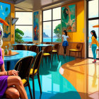 A vibrant, sunny room features a woman in a yellow dress, gazing out at a stunning seascape with mountains and a sailboat. Colorful artwork and lush plants enhance the lively atmosphere.