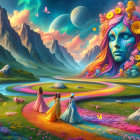 Vibrant Landscape with Serene Woman and Colorful Sky