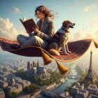 A serene young woman, dressed in a flowing gown and floral crown, reads a book while seated on a floating carpet. Beside her, a small dog enjoys the breathtaking view of Paris and the Eiffel Tower.