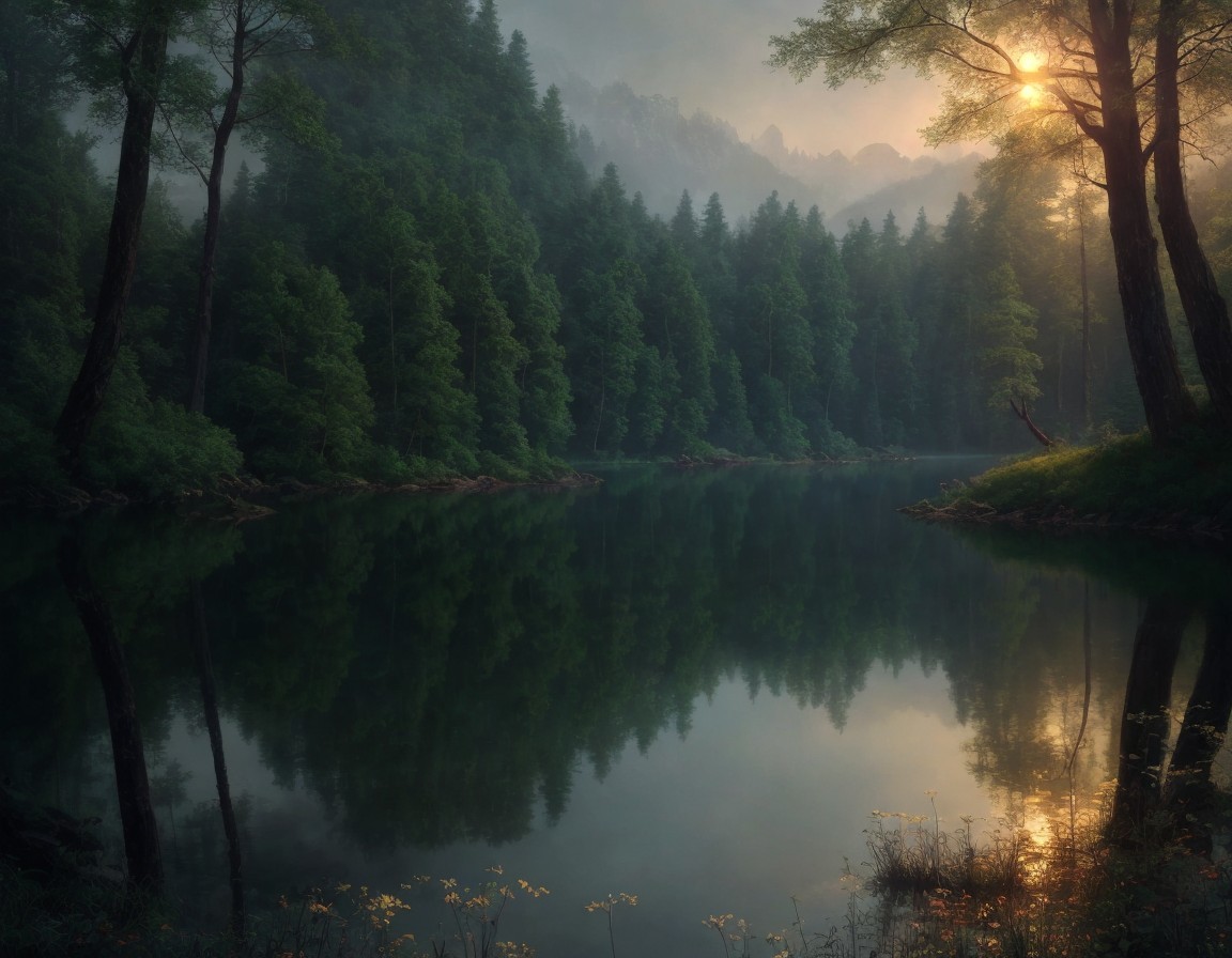 A serene lake at sunrise with reflections of surrounding trees, a gentle mist over the water, and a warm glow through the foliage.