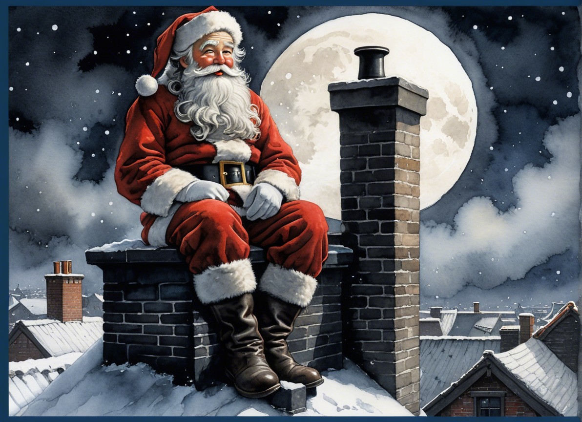 A jolly Santa Claus in a classic red suit sits atop a snow-covered chimney under a bright full moon, surrounded by a wintery night scene with softly falling snowflakes.
