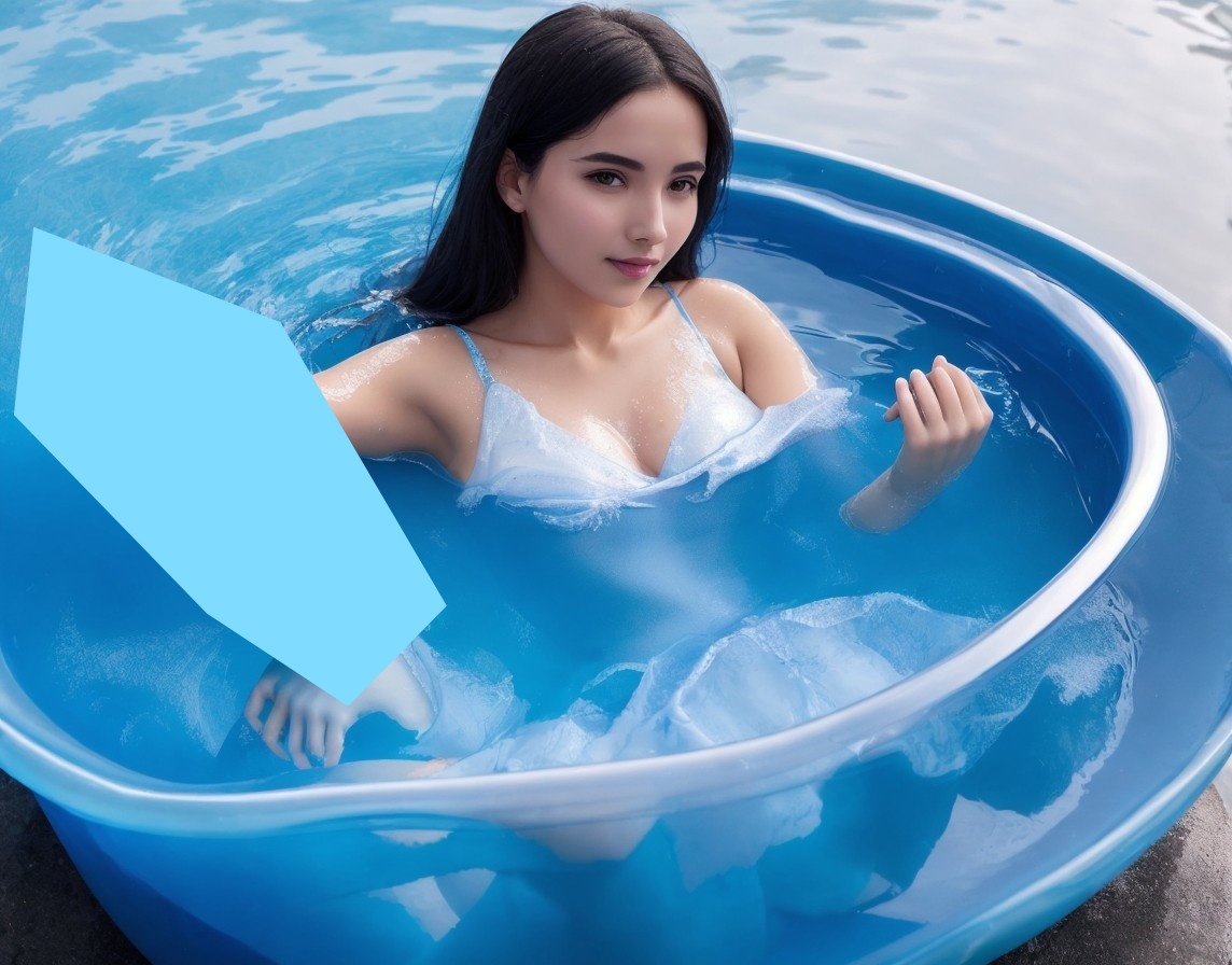 Prompt: full woman's body, disheveled hair, flowing hair, serene parted smile, wearing blue deeply-cut cotton dress , torso zoom-in, splashed with blue painting, sits waist-deep in blue painting bath, many small drops of liquid, carbon dioxide bubbles in the water, insane depth and scale, photorealistic reflecting sunlight bokeh cel-shaded, particles by Alberto Seveso, breathtaking intricate details, lifelike cgi diorama, dramatic cinematic lighting, reflective catchlight