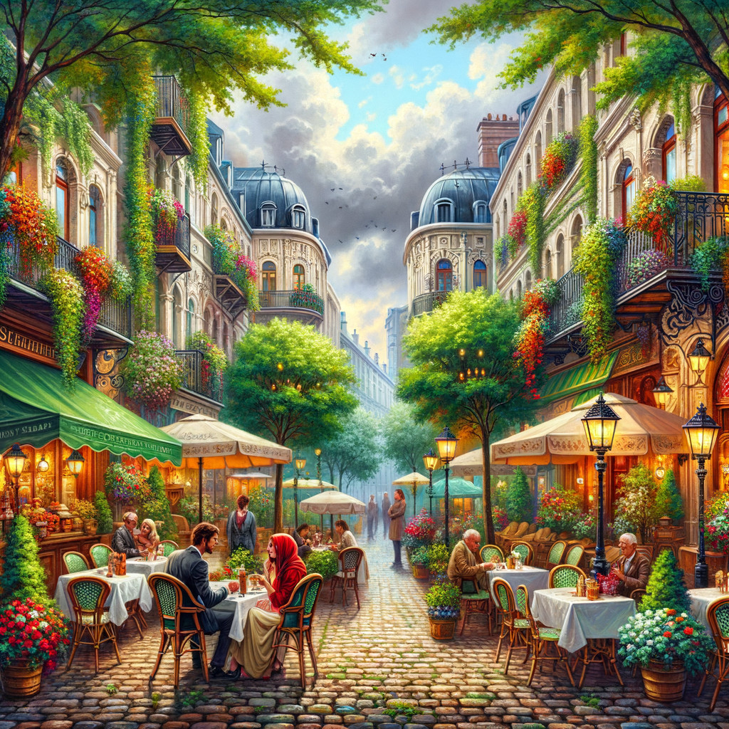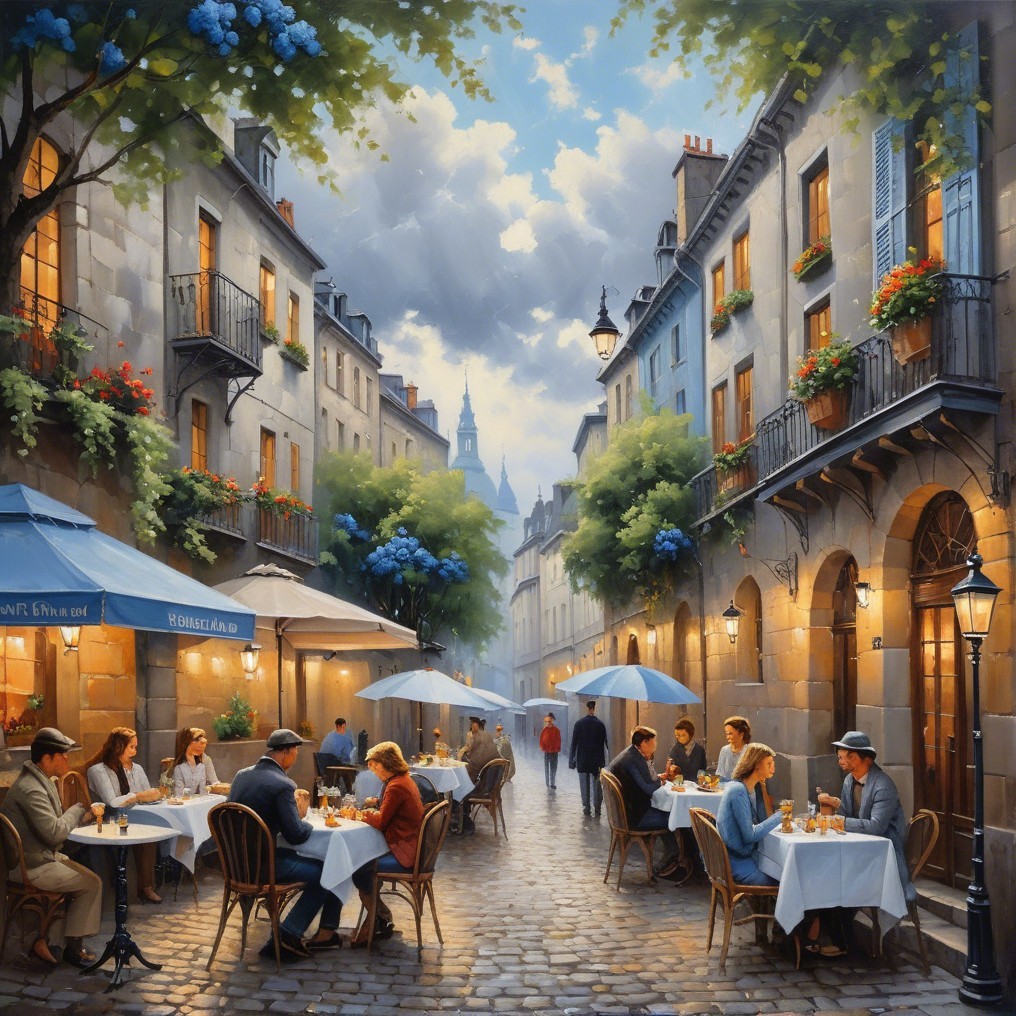 Prompt: "Cosy street cafes, charming terraces, lush green trees, vibrant flowers, diverse architectural styles, people figure dining and chatting, cosy ambience, cobblestone street, vintage street lamps, European-inspired setting, overcast sky, impending rain clouds, soft color transition, dramatic atmosphere, urban landscape, intricate details, warm colour palette with pops of reds, greens, and yellows, soft natural lighting, oil on canvas, medium paint strike, Artstation."