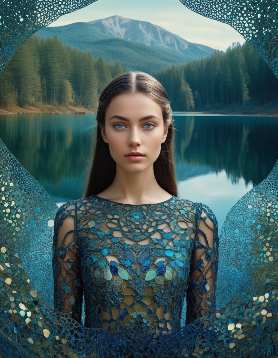 A serene young woman gazes directly at the viewer, framed by intricate lace and nature, with a reflective lake and lush mountains in the background, creating a harmonious blend of beauty and tranquility. (Inspiered By Deception)