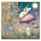 A whimsical illustration features a mouse perched on a vibrant, spotted mushroom under a softly glowing moon, surrounded by intricate patterns and colorful fungi in a dreamy landscape.