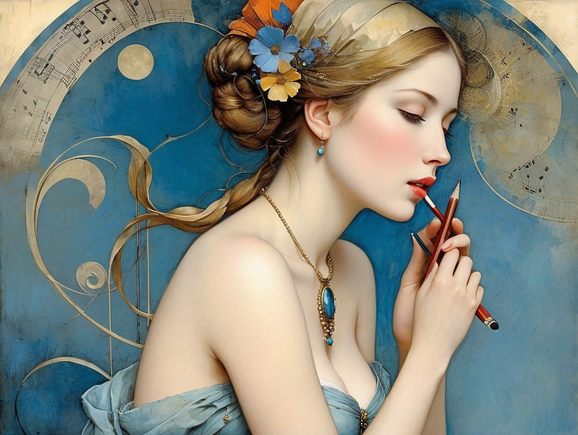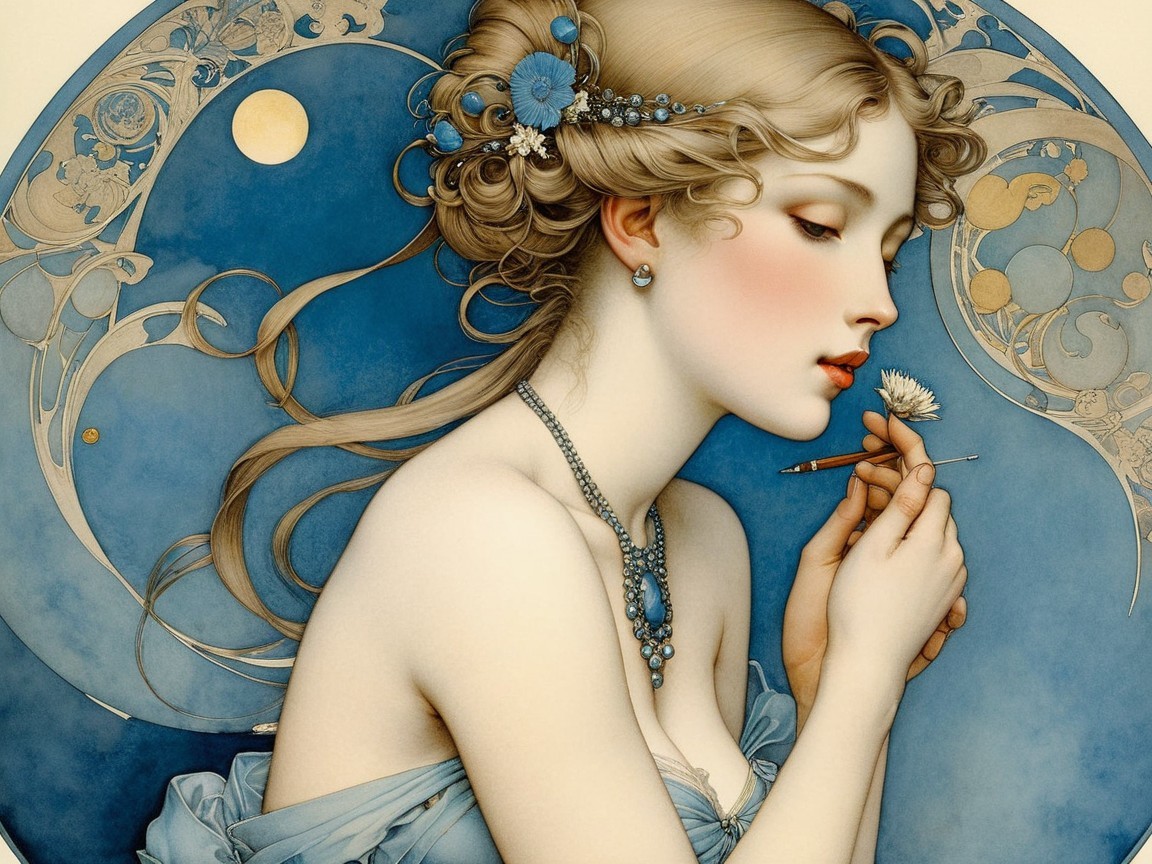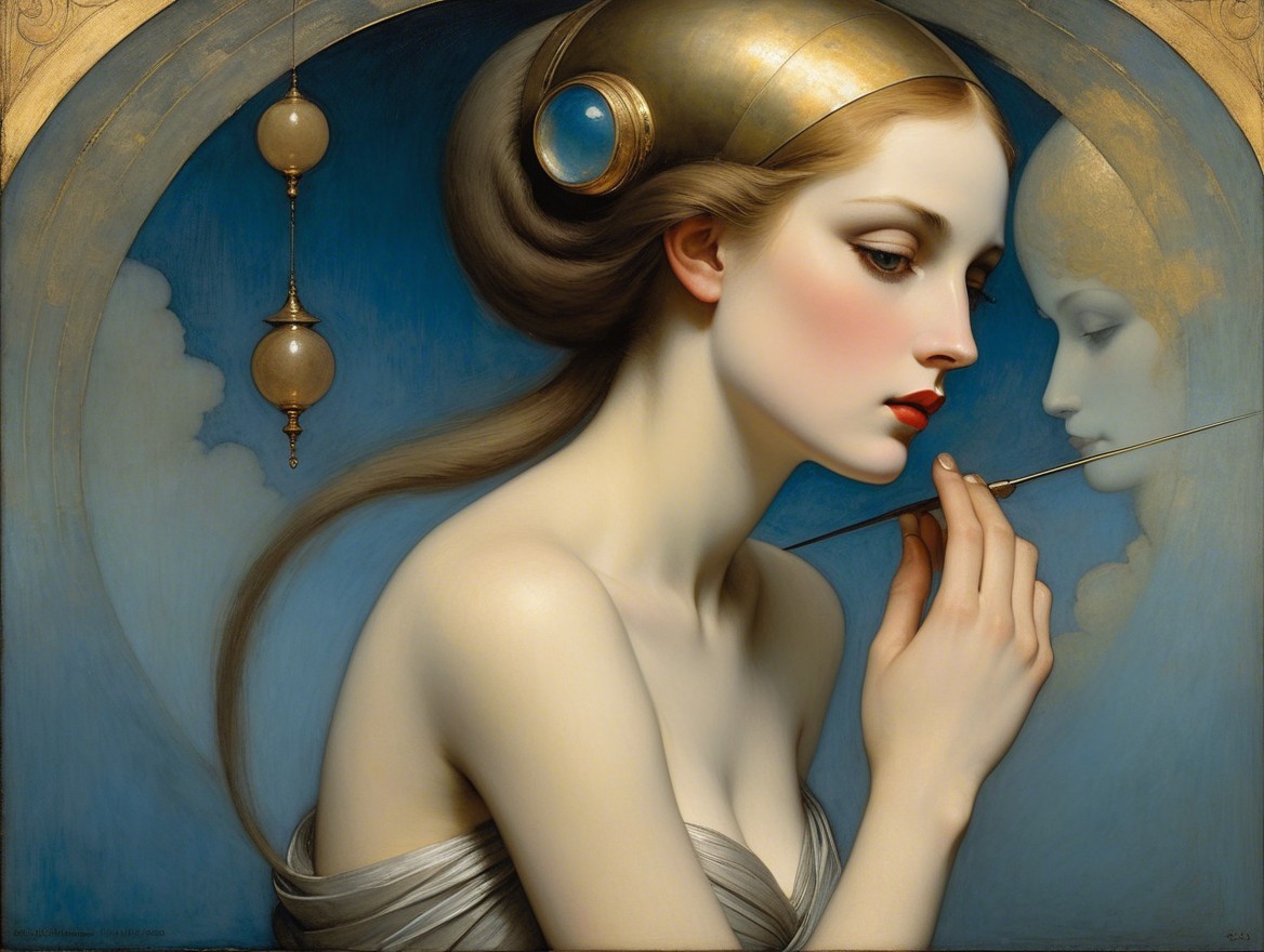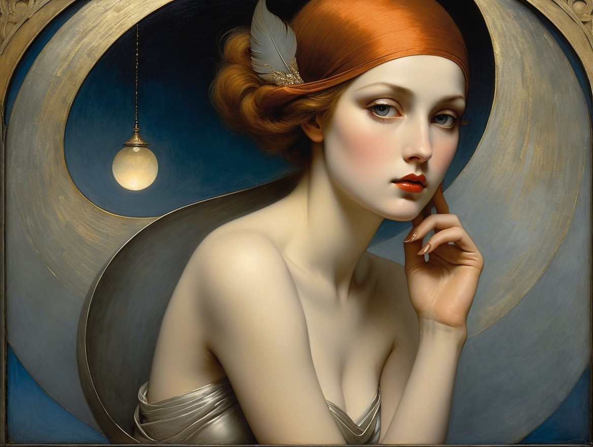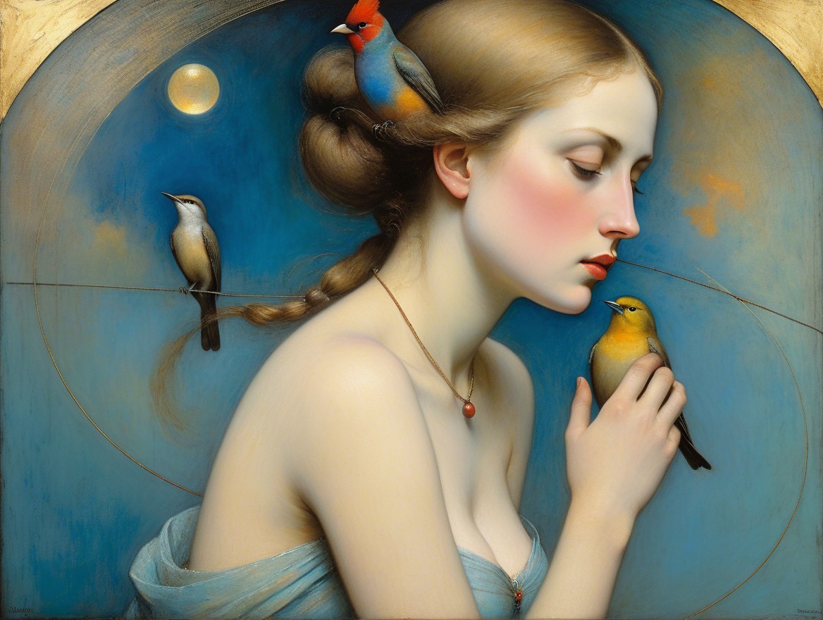 The image features a woman with striking red hair and elegant features, gazing thoughtfully. A white bird perches beside her, set against a circular, golden frame. The atmosphere is serene and artistic.