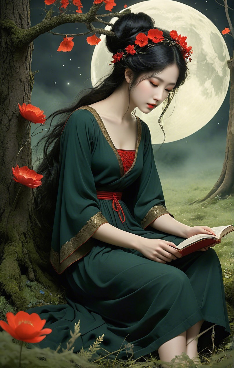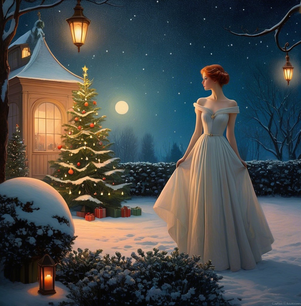 A serene woman adorned with antlers and holly, seated on a tree branch. She wears a flowing gown and gently holds a basket with two playful foxes, surrounded by a dreamy forest backdrop.