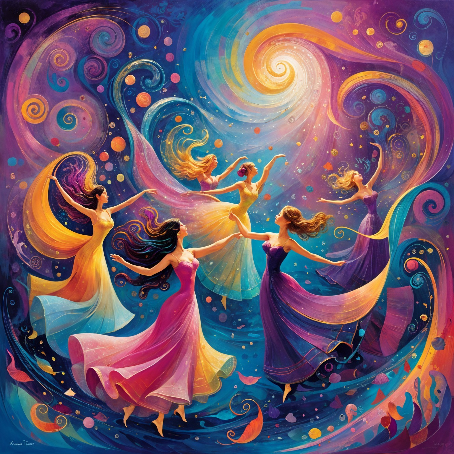 A vibrant, swirling canvas depicts six graceful women dancing joyfully, surrounded by colorful swirls, stars, and cosmic elements, embodying a sense of freedom and celebration.