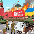 Soviet-era oil painting of Moscow's Red Square (Kremlin Wall) featuring a Ukrainian flag, a tank, and a horse-drawn carriage transporting a washing machine. The scene is set with a blend of historical and anachronistic elements suggesting a narrative about the conflict or social commentary.