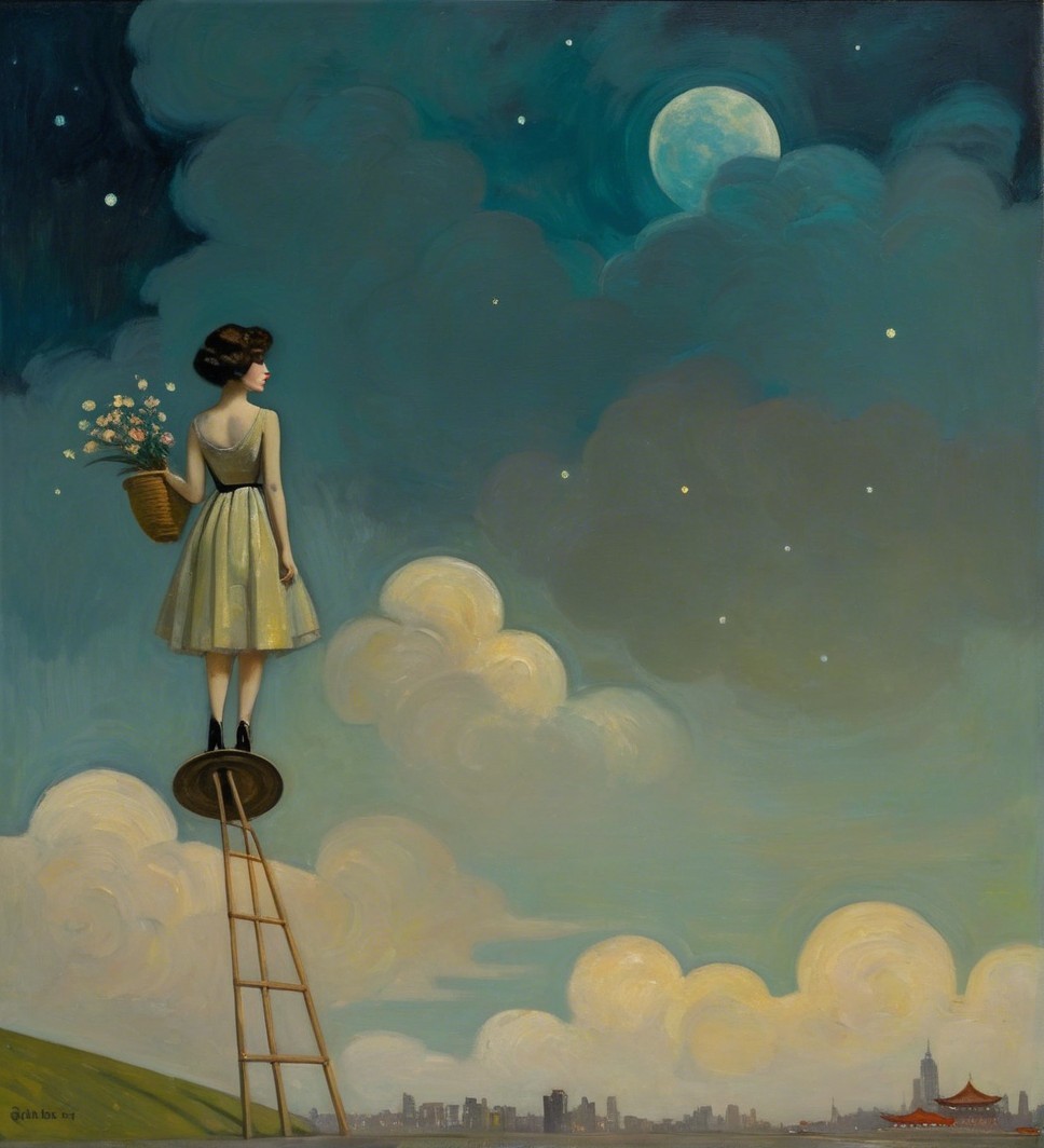 A vibrant landscape showcasing a tall bell tower against a colorful sky. Gondolas line the water, and historic buildings reflect Venice's charm, bathed in warm tones of sunset.
