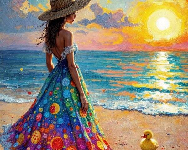 A vibrant scene featuring a stylized seagull in the foreground, surrounded by colorful flowers. In the background, a whimsical cityscape, rolling hills, and a shimmering waterfront add charm.