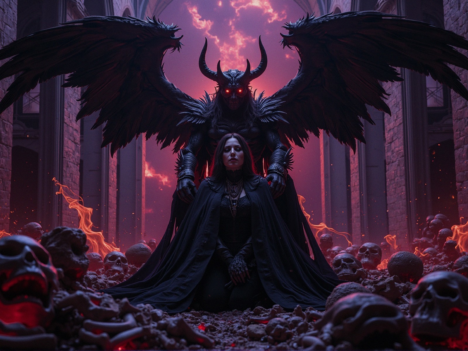 A powerful female figure with long dark hair, dressed in black, kneels on a pile of skulls and bones, a large hooded dark figure with glowing red eyes and large dark wings behind her, in a dramatic, dark, and red outdoor setting with flames and fire, surrounded by the ruins of a