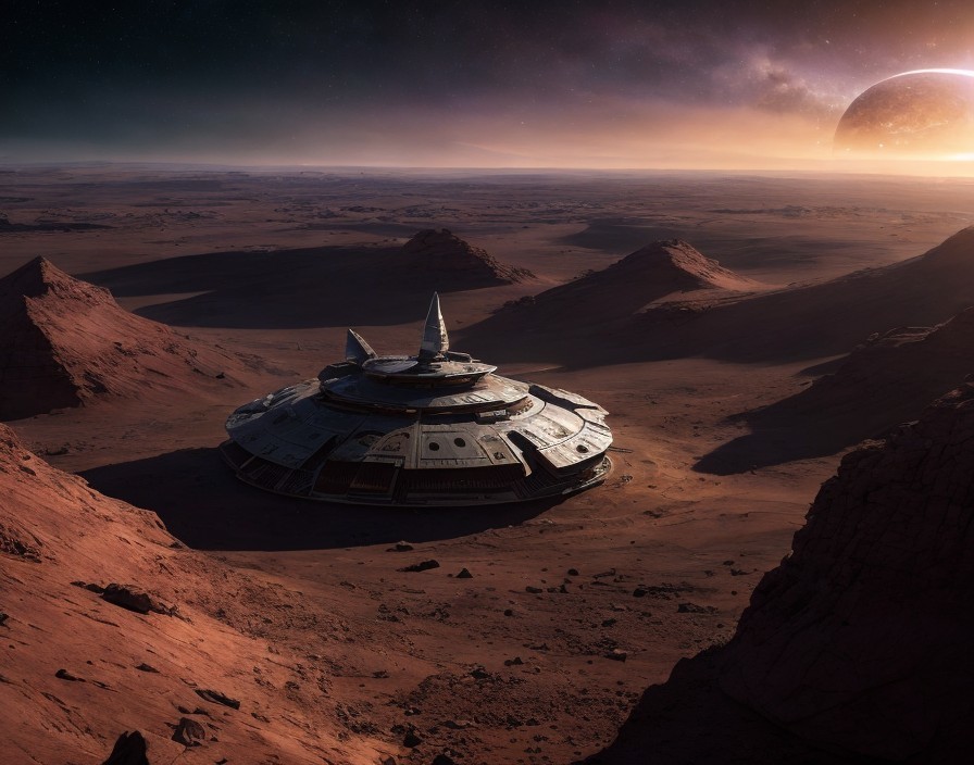 A spacecraft landed on a Mars-like desert planet with towering rock formations under a sky with a large planet and stars.