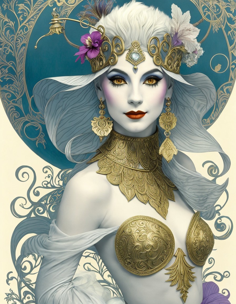 An illustration of a woman with cat-like ears and features, adorned in an ornate costume with a celestial background.