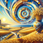 A vibrant landscape features golden wheat fields, a serene lake, and a windmill under a swirling, colorful sky. A vase filled with wheat stands prominently, blending nature and artistry.