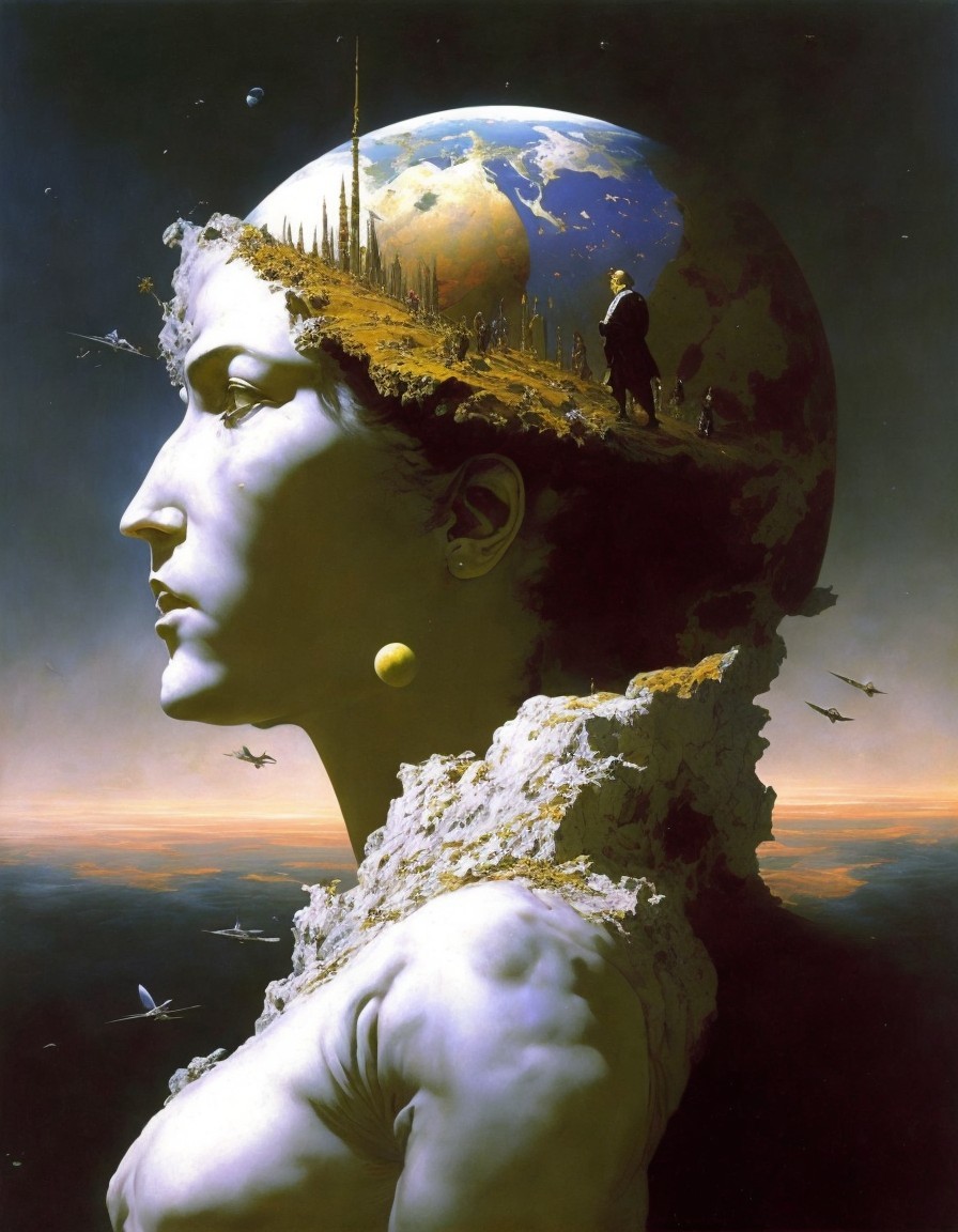A surrealist painting combining a human profile with Earth-like elements against a space backdrop.