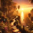 A winding stone path leads through lush greenery and vibrant flowers, illuminated by the golden glow of a sunset reflecting off tranquil ocean waters, framed by palm trees and cliffs.