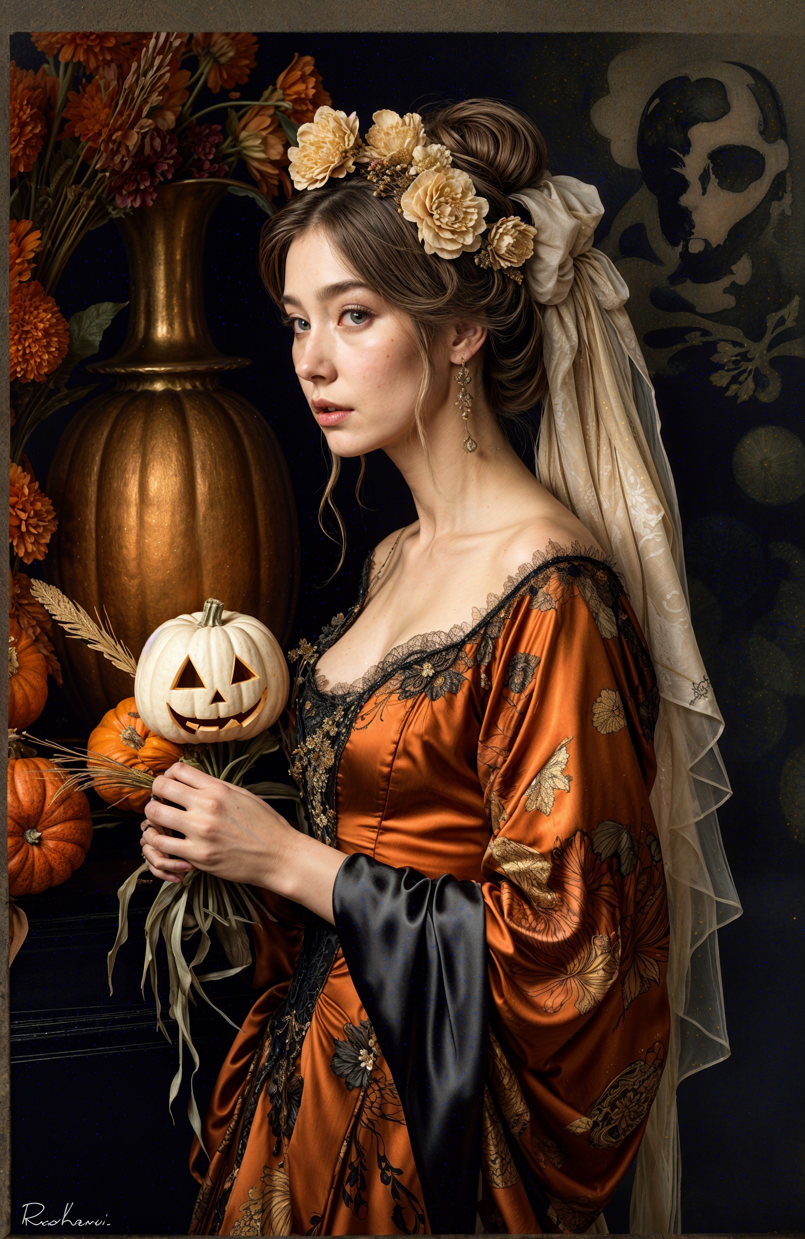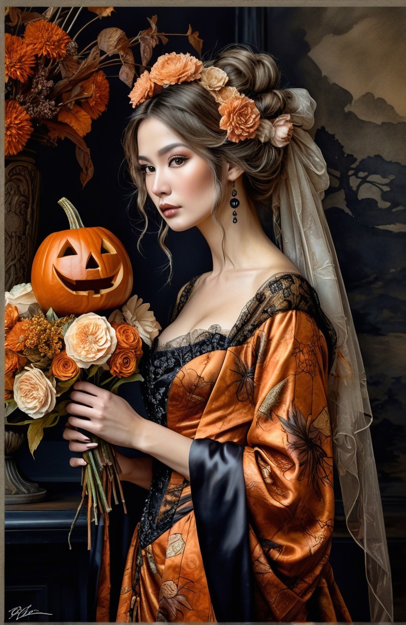 A regal woman in an ornate orange dress holds a bouquet of autumn flowers, with a carved pumpkin beside her. Her elegant look is enhanced by floral accessories in her hair and a dramatic backdrop.