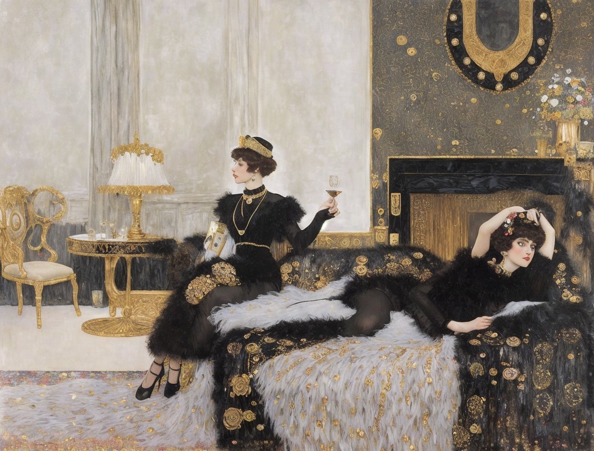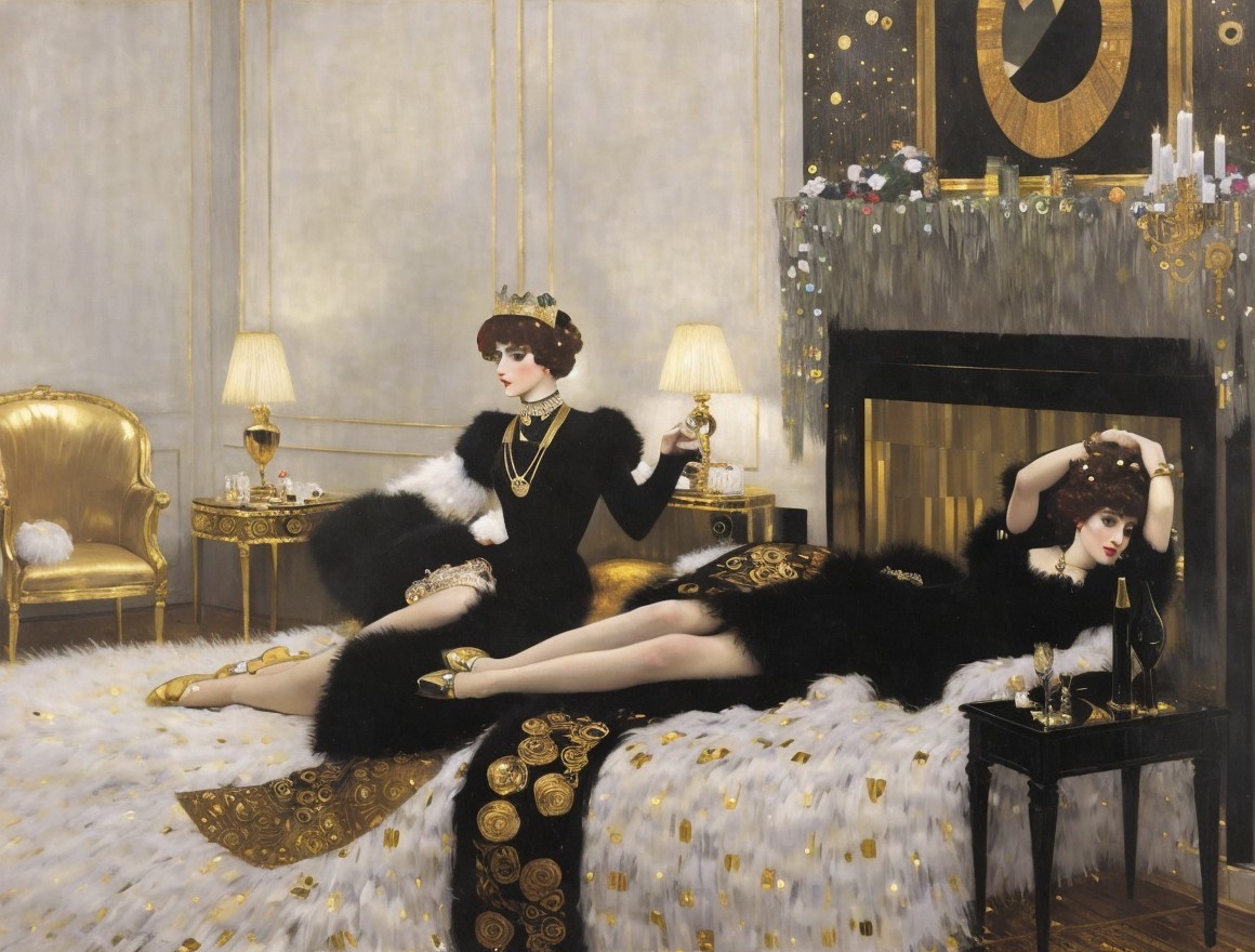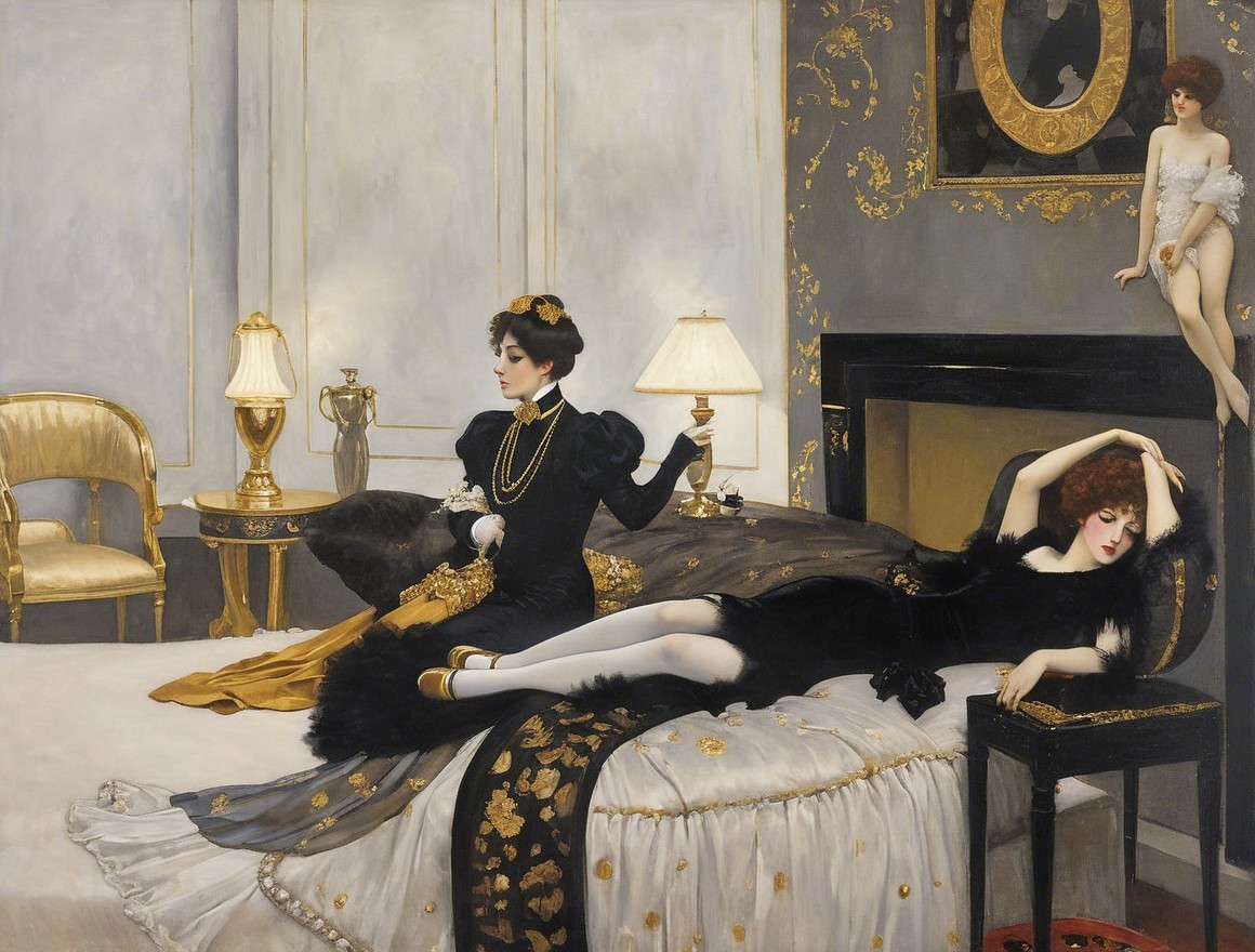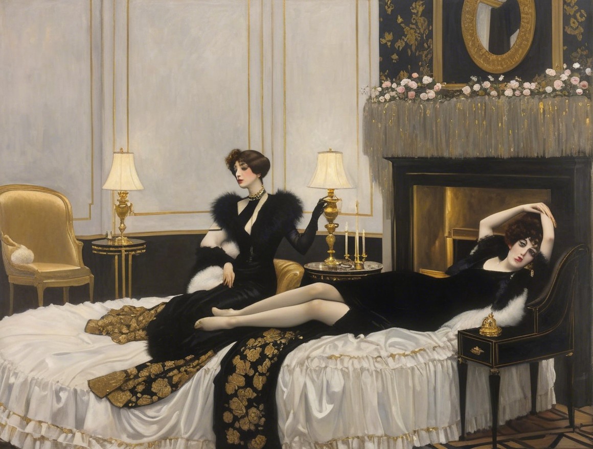 A glamorous woman in an elegant black dress with gold detailing lounges on a bed in a luxurious room, accompanied by a sleek black cat, exuding sophistication and vintage charm.