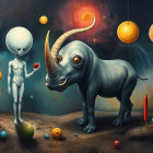 A surreal scene featuring a humanoid figure with a large, round head and an eye-catching rhinoceros. They stand amidst colorful spheres and abstract celestial elements in a dreamlike landscape.