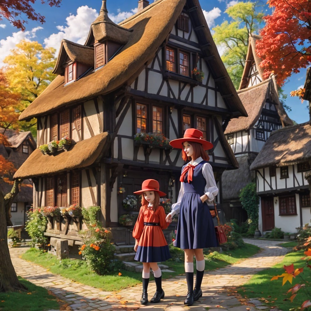 + Prompt:Two anime-style girls in vintage European clothing standing in front of a quaint half-timbered house with a thatched roof. The setting is a picturesque village during autumn, with vibrant orange and red leaves on trees and scattered on the cobblestone path. The older girl wears a blue dress with a white blouse and a large red hat; the younger girl wears a matching red coat and hat. The atmosphere is warm and nostalgic, enhanced by the golden sunlight filtering through the foliage.
