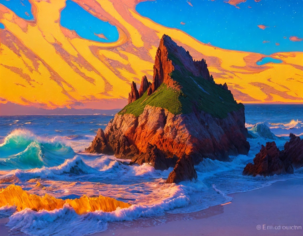 A vivid, surreal landscape with a green rocky islet amidst turbulent blue waves, under a vibrant, textured orange and blue sky.