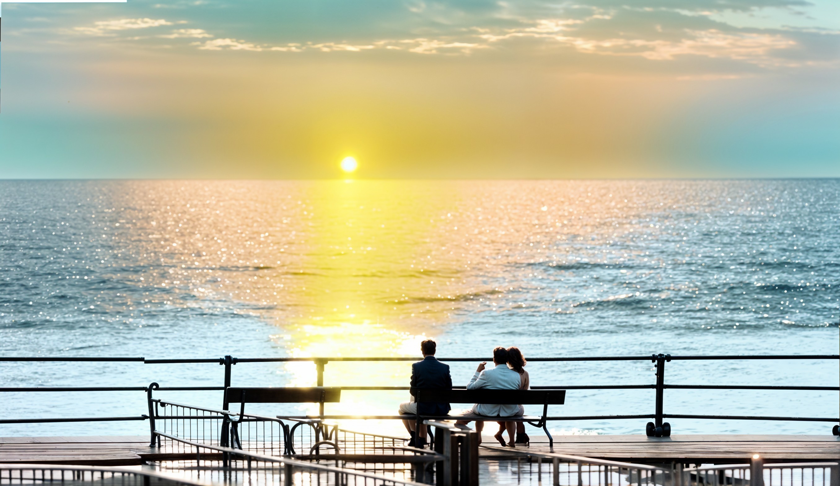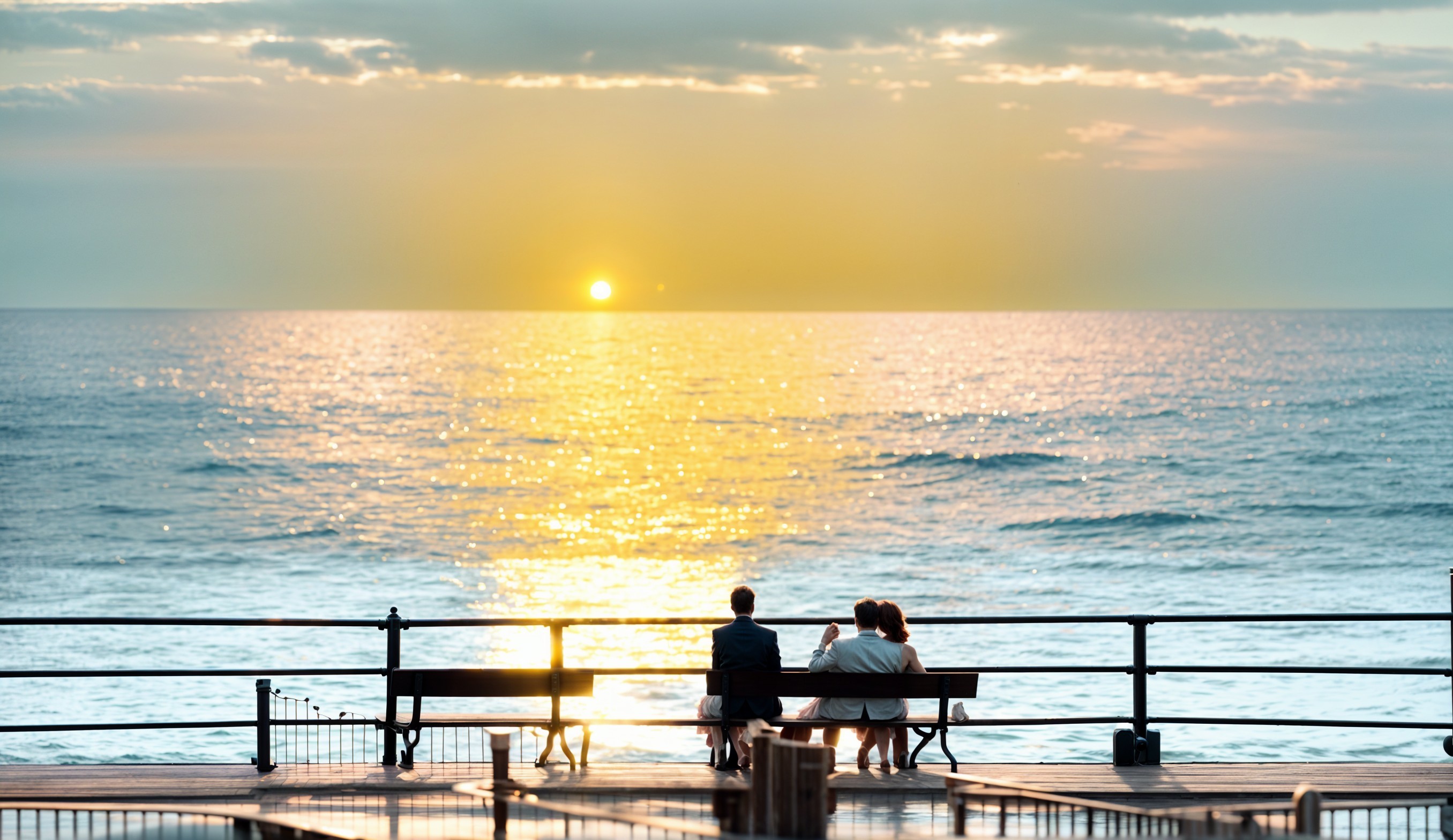 A couple sits on benches by the ocean, facing a beautiful sunset. The golden hues reflect on the water, creating a serene and romantic atmosphere as the day comes to a close.