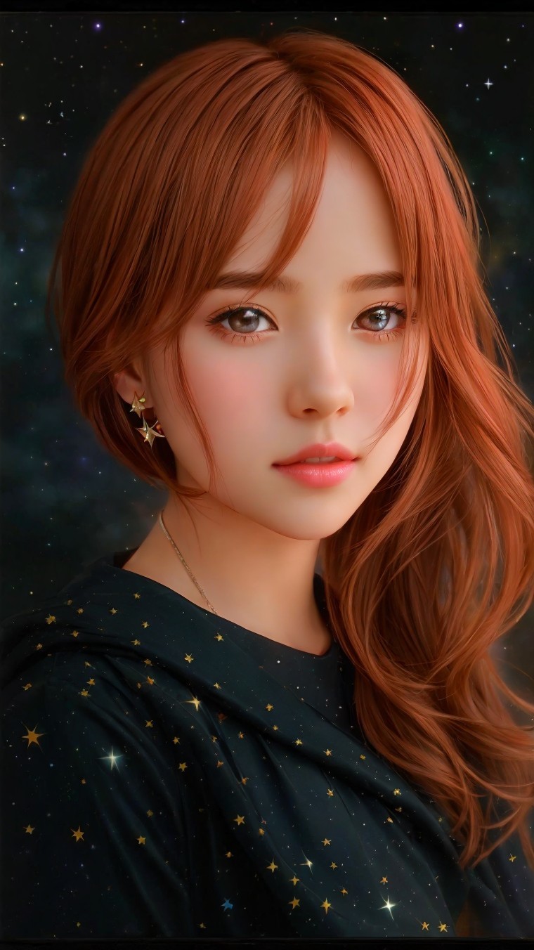 A digital portrait of a woman with chestnut hair and a starry background, highlighted by golden sparkles, exuding a serene, mystical vibe.