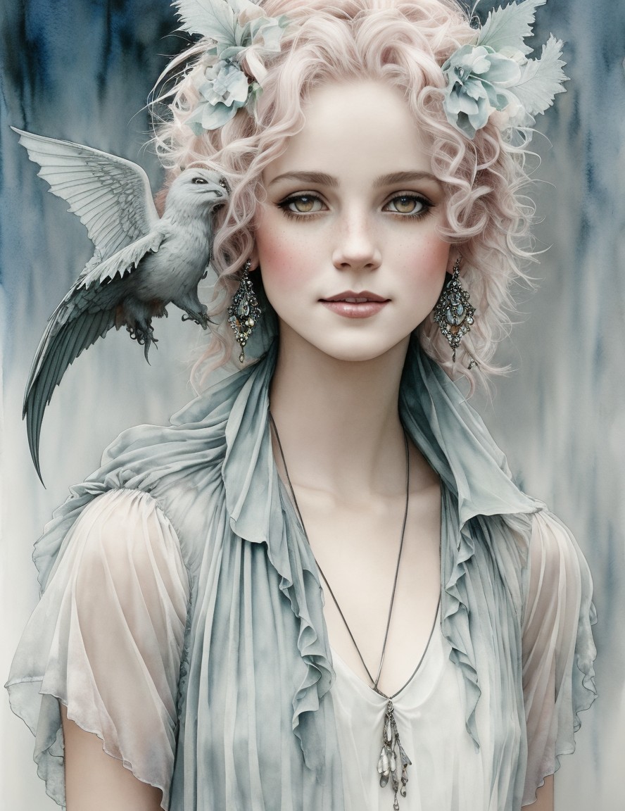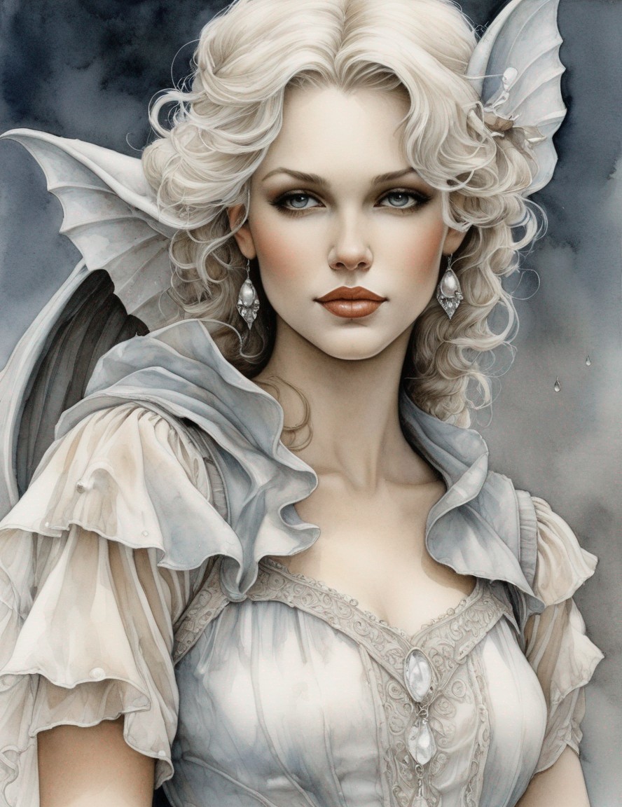 An illustration of a fantasy female character with pointed ears, white hair, winged accessories, and a period dress.