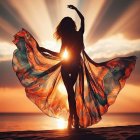 A silhouette of a woman stands on the beach at sunset, wearing a flowing, colorful fabric that catches the light, creating a vibrant display against the shimmering ocean and sky.