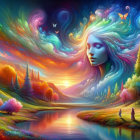 A vibrant, surreal landscape features a dreamlike face merging with colorful swirls and a cosmic sky, surrounded by lush trees and a serene river, embodying harmony and creativity.