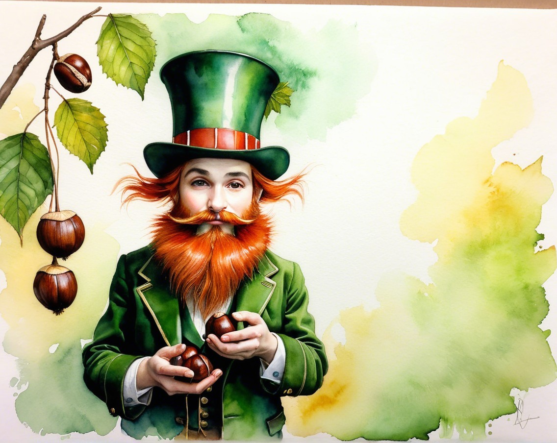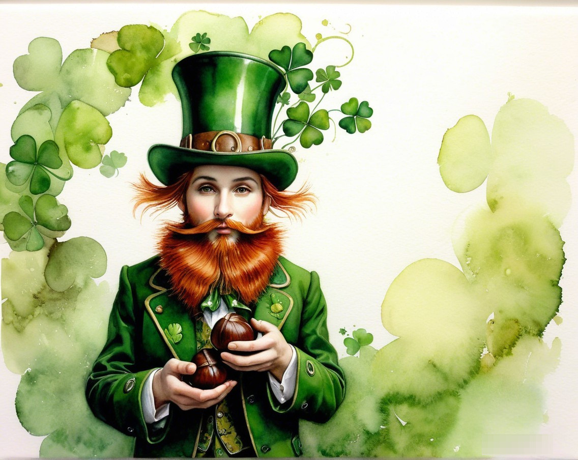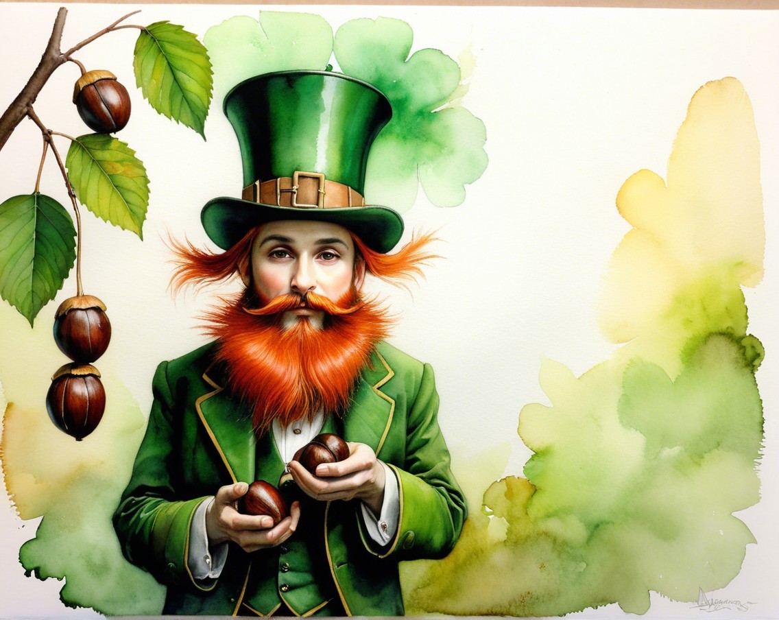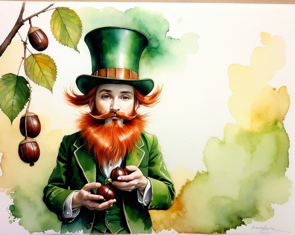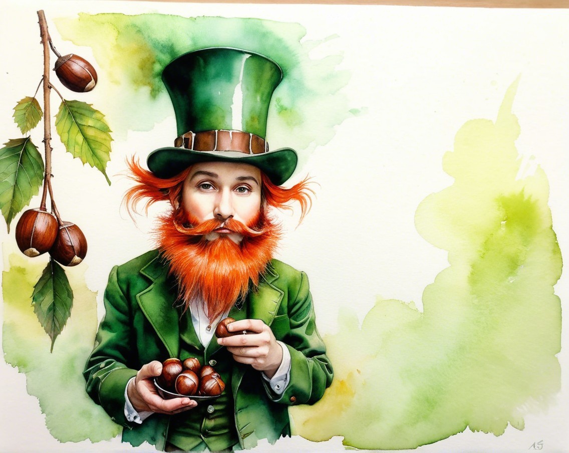 DDG's creation expresses itself thusly: "A young woman dressed in a vibrant green leprechaun outfit holds two chestnuts, surrounded by lush shamrocks. Her bright red hair peeks out from beneath a tall, green top hat."