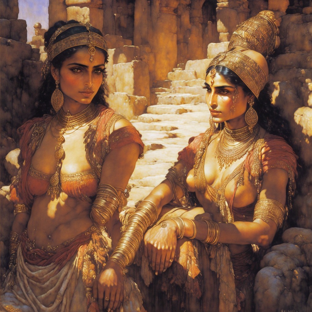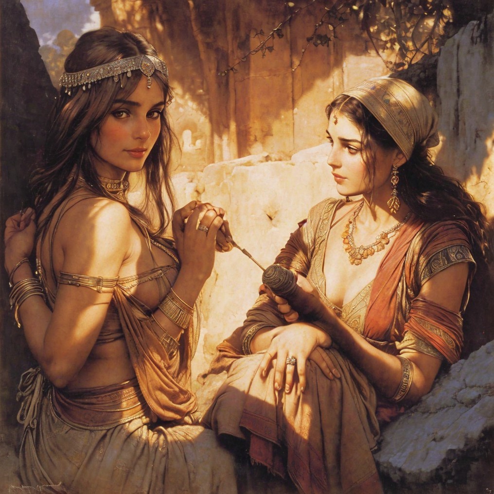 Two women in traditional attire holding brass bowls in an ancient Middle Eastern alleyway.