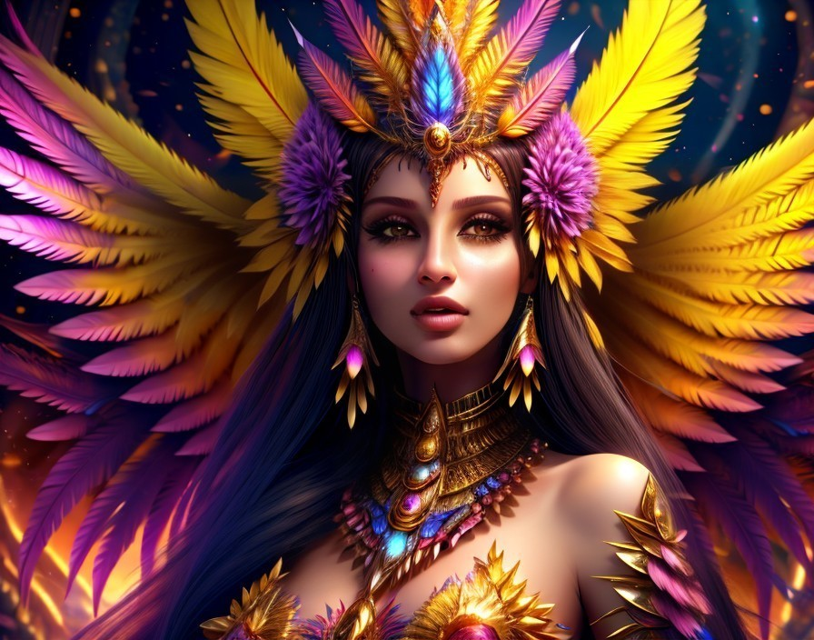 An illustration of a woman with vibrant feathered headdress and wings, adorned with golden jewelry, against a starry backdrop.
